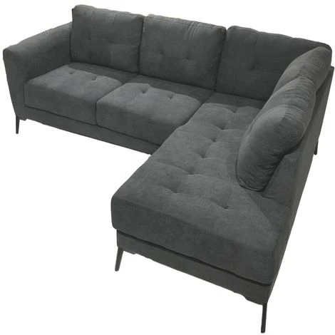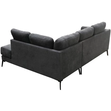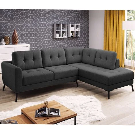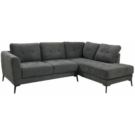 De forme compact, le canapé d’angle Charm est tapissé d’un tissu coloris gris foncé chaleureux et doux au toucher, assise et coussins de dossier capitonnés assurant le confort.