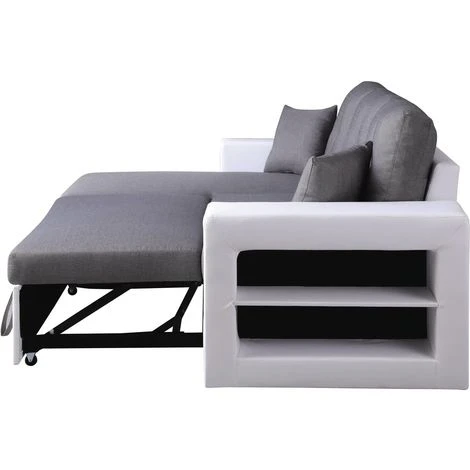 Ce canapé moderne en lin est doté d’étagères intégrées sur le côté.