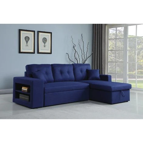 Ce canapé moderne en lin est doté d’étagères intégrées sur le côté.
