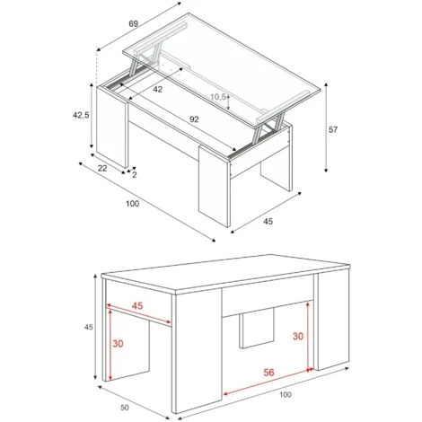 STRUCTURE ET UTILISATION – Table basse avec plateau réhaussable, parfaite pour être placée aussi bien dans le salon que dans la cuisine, elle est idéale si elle est utilisée dans des pièces à espace limité grâce aux mesures standard dont elle est composée – Table basse parfaite pour le salon pour compléter l’espace devant votre canapé ou fauteuil – Un meuble qui peut être utilisé comme surface d’appui polyvalente, un meuble parfait pour meubler une salle d’étude ou de conférence – L’espace conteneur est convient pour contenir des magazines, des livres ou tout ce dont vous avez besoin pour compléter le téléviseur.