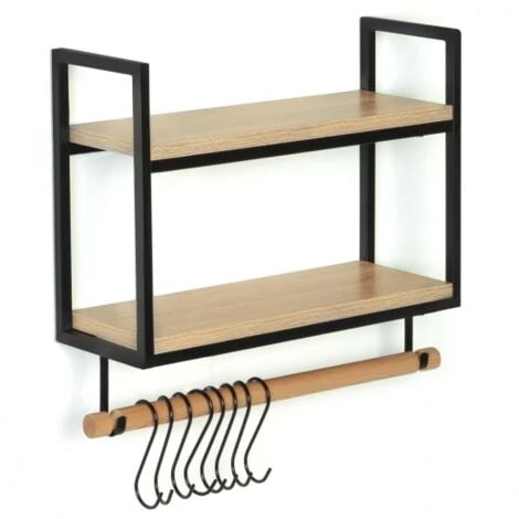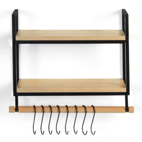 Description de l’étagère murale avec crochets DETROIT design industrielCette étagère murale est indispensable si vous voulez optimiser votre espace tout en apportant une touche de décoration au style industriel. Son mélange de bois et de métal noir habille joliment un mur vide, et apporte des fonctionnalités supplémentaires pour ranger vos vestes, foulards.Sa barre dispose de 8 crochets amovibles très fonctionnelles. Ses crochets en métal sont utiles pour ranger vos accessoires comme vos écharpes, foulards. Ses deux étagères quant à elles, sont idéales pour déposer votre vide poche, une bougie ou des bibelots et ainsi personnaliser votre intérieur.Cette étagère murale s’accroche aussi bien dans une entrée que dans une cuisine pour ranger tous vos épices et autres condiments. Ses 8 crochets amovibles peuvent servir pour accrocher vos torchons et les faire sécher.Avec sa structure en métal, ses planches aspects bois et ses tubes en métal de 1,3 cm x 1,3 cm, vous pouvez l’accrocher où vous voulez. Son étagère aspect bois clair reproduit à la perfection le véritable bois et apporte du cacher à cette étagère murale. Ses deux espaces de rangements peuvent accueillir quelques objets décoratifs.Découvrez dès maintenant les finitions particulièrement soignées de l’étagère murale avec crochet DETROIT à petit prix.Profitez de cette étagère murale au design tendance pour moderniser votre entrée et organiser votre espace de vie !Dimensions de l’étagère murale avec crochetsDimensions globales : L. 43x l. 15 x H. 40 cmMatériaux : métal + panneaux de particulesTubes en métal : 1,3 cm x 1,3 cmCouleurs bois et métalVisserie incluseDécouvrez l’ensemble de notre collection DETROIT sur notre site internet : Collection DETROITEt également tous nos meubles au style industriel : Collection meubles industriels