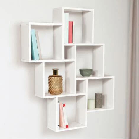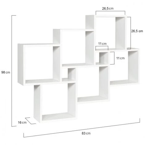 Descriptif de l’étagère murale double position LUCAS blancheAvec son style épuré et sa finition blanche, cette étagère murale double position habillera avec élégance les murs de votre intérieur, tout en offrant un grand espace de rangement. Le blanc lumineux de sa structure et sa fixation discrète mettra en valeur tous vos objets pour les transformer en véritables éléments de décoration.Facile d’installation, avec les attaches métalliques fournies, cette étagère design peut s’utiliser en position horizontale ou verticale. Esthétiques et fonctionnels, ses compartiments carrés de différentes tailles (26,5×26,5 cm et 11×11 cm) en font un meuble idéal pour ranger et exposer toute sorte d’objets.Livres, CD, cadres photos et autres bibelots, chaque objet trouvera sa place dans les différents emplacements de cette étagère murale.Idéale pour apporter décoration et modernité dans toutes les pièces de la maison, vous libèrerez ainsi de la place au sol ou dans vos placards et gagnerez en capacité de rangement.Pratique et déco, c’est l’étagère qu’il vous faut !Dimensions de l’étagère murale LUCASDimensions globales : Longueur 98 cm x largeur 16 cm x Hauteur 83 cmDimensions des grands carrés : 26,5 x 26,5 cmDimensions des petits carrés : 11 x 11 cmMatériaux : Panneaux de particules de bois (PB)Épaisseur du bois : 1,5 cmKit de fixation inclusEgalement disponible en coloris façon hêtre.Retrouvez toutes nos étagères murales sur notre boutique en ligne