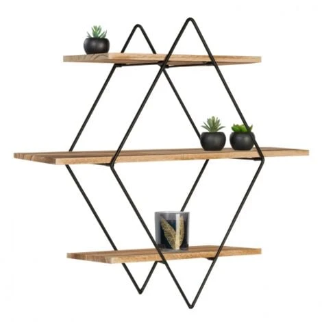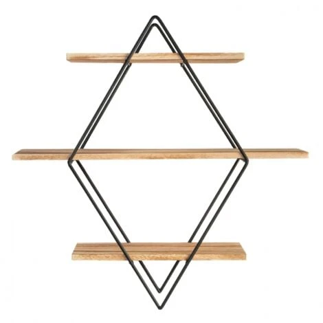 Design simple et épuré, c’est l’accessoire essentiel à avoir chez soi. L’étagère murale losange 3 plateaux droits convient à tous les intérieurs, qu’ils soient contemporains ou plus classiques. Son mélange de métal noir et plateau en bois naturel ne surchargera pas votre intérieur, au contraire, il sublimera vos plus beaux objets !Son utilisation peut être multiple ! Vous lui trouverez facilement une place que ce soit dans une cuisine pour ranger vos condiments, dans une salle de bain pour avoir à portée de main vos produits de beauté et parfums, mais aussi dans un salon pour ranger vos petits objets de décoration et les mettre en valeur.Avec sa forme losange et ses 3 niveaux alignés, vous apporterez une touche de modernité à votre pièce.Facile d’installation, avec ces deux attaches métalliques et ses vis incluses ! Il vous suffit de la fixer au mur.Esthétique et pratique, vous lui trouverez rapidement une place chez vous. Profitez de son petit prix !Dimensions de l’étagère losangeDimensions globales : Longueur 50 x largeur 50 x Hauteur 19 cmÉpaisseur du bois : 0,9 cmÉpaisseur du métal : 0,4 cmMatériaux : métal noir et boisVis inclusesÀ monter soi-mêmeDimensions des 3 plateaux – (du bas vers le haut) :- Plateau 1 : L. 30 x l. 19 cm- Plateau 2 : L. 50 x l. 19 cm- Plateau 3 : L. 30 x l. 19 cm- Hauteur entre chaque plateaux : 16 cmAutre modèle disponible :- Étagère murale ronde LILY 4 niveaux