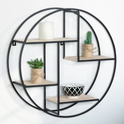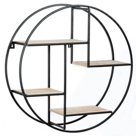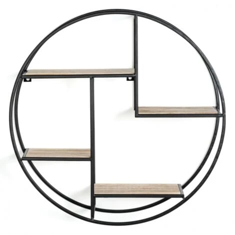 Descriptif de l’étagère murale ronde LILY 4 niveaux design industrielDesign simple et épuré, c’est l’accessoire essentiel à avoir chez soi. L’étagère murale ronde 4 plateaux décalés convient à tous les intérieurs, qu’ils soient contemporains ou plus classiques. Son mélange de métal noir à la structure épaisse et plateau bois naturel ne surchargera pas votre intérieur, au contraire, il sublimera vos plus beaux objets !Son utilisation peut être multiple ! Vous lui trouverez facilement une place que ce soit dans une cuisine pour ranger vos condiments, dans une salle de bain pour avoir à portée de main vos produits de beauté et parfums, mais aussi dans un salon pour ranger vos petits objets de décoration et les mettre en valeur.Avec sa forme ronde, sa structure soulignée de métal noir épais et ses 4 niveaux étagés, vous apporterez une touche de modernité à votre pièce.Facile d’installation, avec ses deux attaches métalliques et ses vis incluses, il vous suffit de la fixer au mur.Esthétique et pratique, vous lui trouverez rapidement une place chez vous. Profitez de son petit prix !Dimensions de l’étagère- Diamètre 50 cm x Profondeur 15 cm- Epaisseur du bois : 1 cm- Epaisseur du métal : 0,8 cm- Matériaux : métal noir et bois- Vis inclusesDimensions des 4 plateaux (du bas vers le haut) :- Plateau 1 : Longueur 16,5 cm x largeur 15 cm- Plateau 2 : Longueur 21,5 cm x largeur 15 cm- Plateau 3 : Longueur 20 cm x largeur 15 cm- Plateau 4 : Longueur 26,7 cm x largeur 15 cm