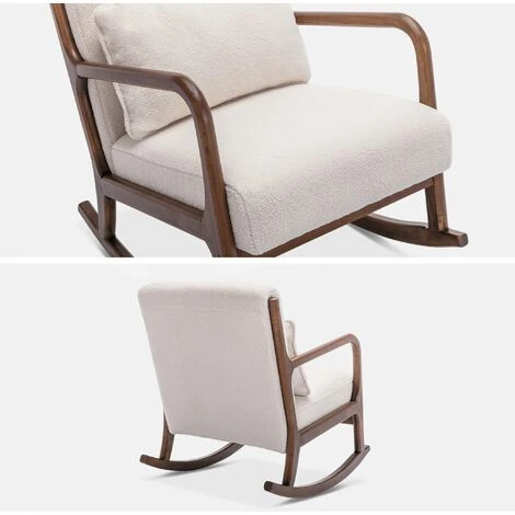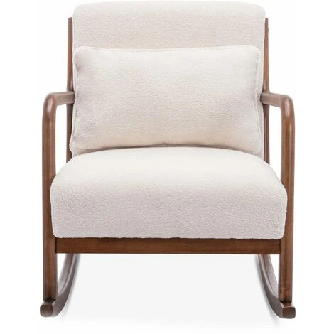 Avec ses lignes arrondies et sa structure en bois solide et chaleureuse, ce fauteuil donnera un côté zen et épuré à votre intérieur. Pour profiter d’un moment de relaxation, les pieds arrière sont inclinés et un coussin rectangulaire est inclus. Son revêtement bouclette douillet, effet laine de mouton, vous donnera envie de vous blottir dans ce petit cocon et pour encore plus de détente, profitez de son balancement grâce à ses pieds à bascule. Ce fauteuil trouvera sa place dans votre salon ou dans la chambre de votre bébé.