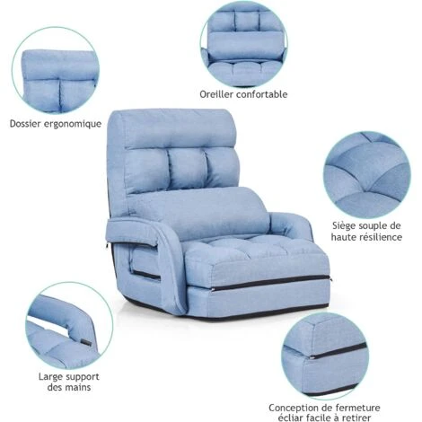 - Le fauteuil est designé contemporain pour une parfaite intégration dans l’espace intérieur. Il est fabriqué en lin, favorable à la peau, résistant à l’usure. Remplissage par du coton recyclé, souple mais sans perte de soutènement. Le réglage libre en 5 positions, de 90 degré à 180 degré, le levier peut ajuster librement l’angle du dossier pour soulager la fatigue. En réglant simplement le levier au cinquième rapport, le fauteuil sera plié de façon à être facilement rangée sans occuper d’espace. Le coussin et le dossier de chaise peuvent être facilement enlevés pour nettoyer. Un fauteuil, multifacettes pour répondre à vos besoins.