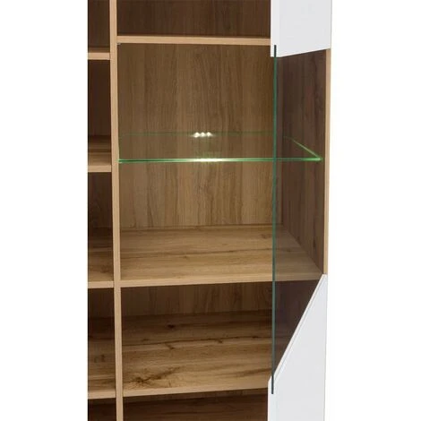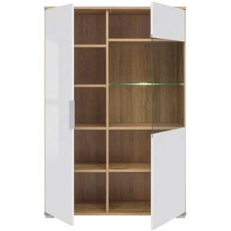 Cette large vitrine double a 2 portes dont une est une face en verre trempé, et 10 compartiments. La face pleine a une poignée minimaliste intégrée dans le bord des faces, tandis que la deuxième partie avec la face en verre s’ouvre au moyen du système push to open. L’offre ne comprend pas l’éclairage, POINTS FORTS: Style scandinave, 2 portes+10 compartiments, Construction spacieuse, Finition: faces en blanc brillant, corps aspect bois, Fabriqué en Europe, CARACTÉRISTIQUES TECHNIQUES: Profondeur 41 cm, Largeur 90 cm, Hauteur 132.5 cm, Matériau : panneau meuble+verre trempé, À monter soi-même, Photos des articles le plus fidèle possible, mais restant non contractuelles, les nuances de couleur et le rendu des matières présentés à l’écran pouvant être différents de la réalité