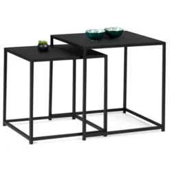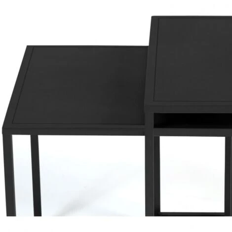 Descriptif des 2 tables basses gigognes carrées DAVISQue votre déco soit urbaine, classique ou contemporaine, soyez certain que ce lot de 2 tables basses s’y fondra parfaitement. Les plateaux en métal noir mat offrent un véritable design industriel à ces tables de salon.Leurs lignes sobres et épurées font d’elles un élément de décoration à part entière, qui s’intégrera parfaitement dans votre maison. Esthétiques, ces jolies table DAVIS au design industriel trouveront idéalement leur place dans les intérieurs urbains et contemporains, mais aussi plus rustiques. Le coloris noir mat de la structure et du plateau habillera avec élégance votre intérieur.Fonctionnelles et pratiques, ces tables gigognes sont emboitables. Vous pouvez les moduler à votre guise, selon vos envies. L’une à côté de l’autre pour un apéro convivial entre amis ou bien l’une sous l’autre pour un gain de place !Dans votre chambre, votre salon, ou même votre véranda, ces 2 tables se glissent partout. Elles peuvent aussi se dissocier pour meubler 2 pièces différentes. Vous pourrez les utiliser en tables basses de salon, en tables d’appoint, en bouts de canapé ou en tables de chevet pour votre chambre !La structure en métal confère robustesse et solidité aux 2 tables basses carrées DAVIS !Faites-vous plaisir grâce à ce lot de 2 tables basses gigognes à l’esprit factory pour pas cher !Dimensions du lot de 2 tables basses gigognes carrées en métalDimensions de la grande table : Longueur 45 cm x largeur 45 cm x Hauteur 45 cmDimensions de la petite table : Longueur 40 cm x largeur 40 cm x Hauteur 40 cmÉpaisseur des tubes en métal : 1,6 cm x 1,6 cmDécouvrez l’ensemble de nos tables basses gigognes ainsi que notre collection métal sur notre boutique en ligne !