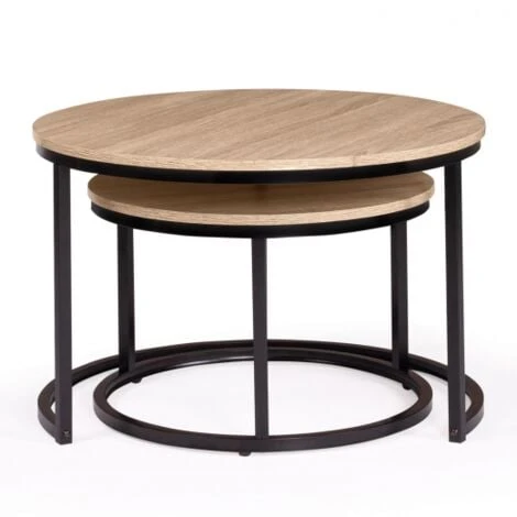 Que votre dĂ©co soit urbaine, classique ou contemporaine, soyez certain que ce lot de tables basses rondes s’y fondra parfaitement. La structure en mĂ©tal noir et le plateau couleur bois offrent un vĂ©ritable design industriel Ă ces tables basses. Leurs lignes sobres et Ă©purĂ©es font d’elles un Ă©lĂ©ment de dĂ©coration Ă part entière, qui s’intĂ©grera parfaitement Ă votre intĂ©rieur. Le plateau en particules de bois offre un aspect Ă la fois chaleureux et authentique Ă votre pièce de vie. Bien stables sur leur structure en mĂ©tal, ces tables gigognes rondes DETROIT vous assurent robustesse et soliditĂ©.Fonctionnelles et pratiques, ces tables basses gigognes rondes style industriel sont imbricables, vous pouvez les moduler Ă votre guise, selon vos envies. L’une Ă cĂ´tĂ© de l’autre pour un apĂ©ro convivial entre amis ou bien l’une sous l’autre pour un gain de place !Dans votre chambre, votre salon, ou mĂŞme votre vĂ©randa, ces petites tables se glissent partout. Vous pourrez les utiliser en tables basses de salon ou en tables d’appoint. N’hĂ©sitez pas Ă vous servir des plateaux pour y disposer bougie, plante verte, lampe, objets de dĂ©co… pour un look 100% industriel !Faites-vous plaisir grâce Ă ce lot de 2 tables basses gigognes rondes au style industriel pour pas cher.Dimensions des 2 tables basses gigognes rondes DETROITDimensions de la petite table : Longueur 54 cm x largeur 54 cm x Hauteur 35,5 cmDimensions de la grande table : Longueur 70 cm x largeur 70 cm x Hauteur 46 cmÉpaisseur des tubes en mĂ©tal : 1,6 cm x 1,6 cmÉpaisseur du bois : 1,5 cmA monter soi-mĂŞmeRetrouvez l’ensemble de notre collection industrielle sur notre boutique en ligne !