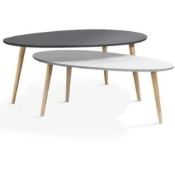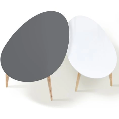 Doté d’un design élégant typé nordique, ce lot de 2 tables basses apportera un vrai cachet à votre salon. Véritables éléments de décoration, ces 2 tables gigognes s’installent selon votre besoin et conviennent parfaitement aux petits comme aux grands espaces.Elles se combinent afin d’allier praticité et esthétisme devant votre canapé et pourquoi pas sur un joli tapis. La petite table (dim: L.88 x l.48 x H.34 cm) se dispose sous la plus grande table (dim : L.98 x l.60 x H.40 cm) si vous souhaitez gagner de la place.Grâce à leurs tailles et coloris différents, elles peuvent également servir comme table d’appoint, pour prendre un thé ou encore disposer plantes et divers objets de décoration, et parer à toute éventualité !Leur forme ovale et leurs pieds en bois de pin reflètent un style tout droit venu de la tendance scandinave.Chaque table possède une surface laquée brillante pour apporter une vraie touche contemporaine à votre intérieur. Dimensions des tables basses gigognes GIGIDimensions de la grande table basse : Longueur 98 cm x largeur 60 cm x Hauteur 40 cmHauteur des pieds de la grande table basse : 40 cmDimensions de la petite table basse : L. 88 cm x l. 48 cm x H. 35 cmHauteur des pieds de la petite table basse : 33 cmDiamètre des pieds : 3,5 cmStructure en panneaux de particules boisÀ monter soi-mêmeVendu par lot de 2 tables basses gigognes : 1 table basse grand modèle au coloris gris + 1 table basse petit modèle au coloris blancDifférents coloris disponibles sur notre boutique en ligne :- BLANC/BLANC- GRIS ET JAUNE- BLANC ET JAUNE- BLANC MOTIFS BLANC JAUNE GRIS