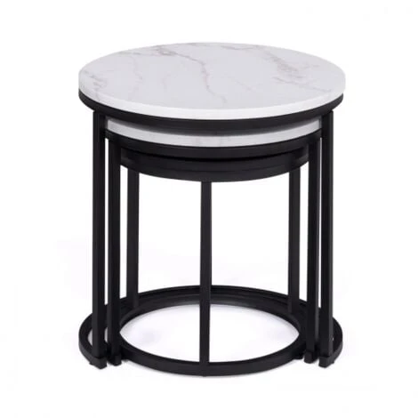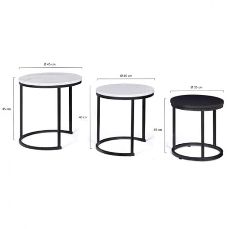 Offrez à votre salon une touche élégante avec notre lot de 3 tables basses gigognes rondes ALASKA. Leurs lignes sobres et épurées font d’elles un élément de décoration à part entière, qui s’intégrera parfaitement à votre intérieur. Les plateaux en MDF (épaisseur 1,5 cm) aux coloris façon marbre et noir offrent un aspect à la fois intemporel et élégant à votre pièce de vie dans un style bohème chic. Leur structure de forme ronde en métal noir vous assure stabilité et solidité.Fonctionnelles et pratiques, ces 3 tables basses gigognes rondes au style moderne peuvent être modulées à votre guise, selon vos envies. A disposer l’une à côté de l’autre pour un apéro convivial entre amis ou bien à empiler l’une sous l’autre pour un gain de place optimal !Dans votre chambre, votre salon, ou même votre véranda, ces petites tables se glissent partout. Vous pourrez les utiliser en tables basses de salon, tables d’appoint, bouts de canapé ou même tables de chevet ! N’hésitez pas à vous servir des plateaux pour y disposer bougie, plante verte, lampe, objets de déco… pour un look 100% industriel !Faites-vous plaisir grâce à ce lot de 3 tables basses gigognes rondes effet marbre et bois noir pas cher !Dimensions du lot de 3 tables de salon gigognes ALASKA 35/40/45 cmPetite table basse gigogne : Longueur 35 cm x largeur 35 cm x Hauteur 35 cmMoyenne table basse gigogne : Longueur 40 cm x largeur 40 cm x Hauteur 40 cmGrande table basse gigogne : Longueur 45 cm x largeur 45 cm x Hauteur 45 cmÉpaisseur des tubes en métal : 1,6 x 1,6 cmÉpaisseur des plateaux en MDF : 1,5 cmÀ monter soi-mêmeRetrouvez également dans cette collection notre console double ALASKA.Découvrez l’ensemble de notre collection moderne ainsi que toutes nos tables basses gigognes sur notre boutique en ligne !
