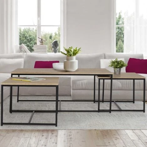 Astucieuses et pratiques, ces 3 tables basses gigognes DETROIT se modulent à volonté dans votre salon. Composé d’une grande table rectangle L.113xl.60xH.45 cm et de deux autres plus petites au format carré L.53xl.53xH.41 cm, ce set se dispose selon votre besoin : – En simple table basse devant le canapé pour poser les télécommandes et magazines, – En dessertes d’appoint bout de canapé pour meubler et décorer votre espace,- Tout en longueur ou en forme de L pour un apéro dinatoire…. Les combinaisons sont multiples ! Elles offrent un excellent compromis pour gagner de la place.Esthétiques et modulables, ces 3 tables basses gigognes DETROIT vous permettront d’aménager votre salon dans un esprit factory avec leurs lignes sobres et contemporaines. Leur design industriel bi-matière en bois et métal noir apportera une vraie touche déco moderne et tendance à votre salon.Stables et robustes grâce à leur structure en métal (tube épaisseur 1.6 cm x 1.6 cm), elles possèdent un plateau en particules de bois (PB épaisseur 1,5 cm).Les 2 petites tables basses gigognes se positionnent à l’intérieur de la grande table basse gigogne :Dimensions des tables basses gigognes industriellesDimensions de chaque petite table basse gigogne : Longueur 53 cm x largeur 53 cm x Hauteur 41 cmDimensions de la grande table basse gigogne : Longueur 113 cm x largeur 60 cm x Hauteur 45 cmÀ monter soi-mêmeAutres modèles de la gamme DETROIT disponibles sur notre boutique en ligne :- Lot de 2 tables basses gigognes DETROIT 40 et 45 cm- Table basse DETROIT design industriel 113 cm