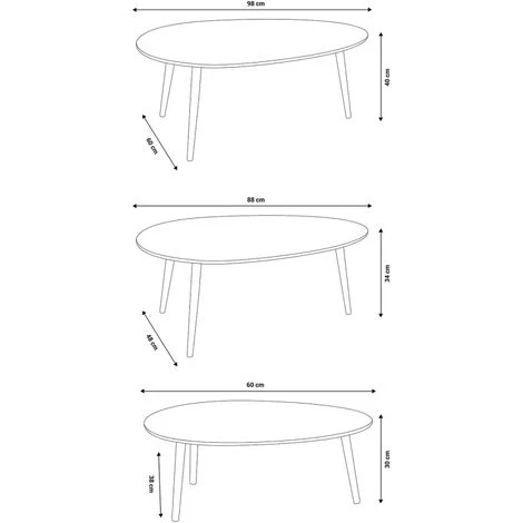 Apportez une vraie touche contemporaine à votre salon-séjour grâce à ce lot de 3 tables basses gigogne laquées blanches et grises qui s’accorderont parfaitement à votre intérieur. Leur design, d’inspiration nordique, est à la fois ultra-tendance, simple et sophistiqué.Libre à vous d’agencer chaque table basse gigogne de la manière dont vous le souhaitez pour créer l’intérieur qui vous ressemble. Eléments de décoration ou tables de rangement pour vos magazines, télécommandes, lampes d’appoint et petites plantes d’intérieur, chacune aura son utilité ! Idéales pour vos soirées télé ou apéritifs entre amis, vous pourrez autrement aisément les placer les unes sous les autres pour gagner de l’espace! Véritables éléments de décoration, les tables basses gigognes apporteront un certain cachet à votre intérieur. Grâce à leur forme ovale et leurs pieds en bois de pin solides, ces tables de salon robustes apportent un côté chaleureux à votre pièce de vie.La surface laquée brillante des tables offre quant à elle une touche contemporaine à votre intérieur et une finition raffinée. Enfin, la déclinaison de coloris laqués gris clair, gris anthracite et blanc créent à la fois de la luminosité et du contraste, pour un design épuré, chic et moderne.Que votre espace salon soit relativement petit ou très spacieux, ce lot de trois tables basses gigognes y trouvera forcément sa place. A utiliser seules, par 2, par 3, avec ID Market, créez une déco tendance à petit prix grâce à ce lot économique de 3 tables basses gigognes scandinave !Dimensions des 3 tables basses gigognes blanc / grisDimensions table grand modèle : Longueur 98 cm x largeur 60 cm x Hauteur 40 cm Dimensions table moyen modèle : Longueur 88 cm x largeur 48 cm x Hauteur 34 cmDimensions table petit modèle : Longueur 60 cm x largeur 38 cm x Hauteur 30 cmÀ monter soi-mêmeCe lot de tables basses se décline sous différents coloris : – Lot de 3 tables basses gigognes laquées blanc/gris/motifs graphiques- Lot de 3 tables basses gigognes laquées gris foncé/blanc/gris clair- Lot de 2 tables basses gigognes laquées PM gris et GM blanc- Lot de 2 tables basses gigognes laquées PM blanc et GM gris- Lot de 3 tables basses gigognes GIGI laquées blanc/bleu- Lot de 3 tables basses gigognes GIGI laquées blanc