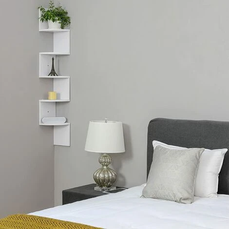 – Optimisez les recoins dans votre maison en mettant en place cette étagère d’angle en zigzag à 5 niveaux. Elle vous permet de présenter vos livres, vos CDs, et vos décors préférés. La conception flottante peut montrer votre plancher ouvert et dégagé réduisant l’encombrement de la maison.