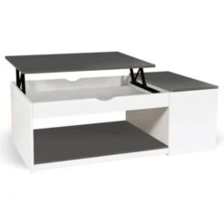 Style et gain de place sont les maîtres-mots de cette table basse à plateau relevable et coffre latéral en bois blanc et gris ELEA. Avec ses nombreux espaces de rangement elle sera un véritable atout pour un intérieur moderne et bien rangé ! Pour manger devant votre série préférée à la télé ou travailler confortablement depuis votre canapé, la table basse à plateau relevable sera parfaite pour vous.Parce que vous recevez sans doute des invités dans votre salon, la table basse bicolore bois blanc et gris est dotée de plusieurs rangements pratiques. Idéal pour vos moments de détente, ce meuble est équipé d’un mécanisme en acier laqué époxy qui permet à la tablette de se relever pour une position confortable et dissimule un premier espace de rangement.Son coffre latéral d’une hauteur de 40 cm est parfait pour ranger quelques bouteilles ainsi que le nécessaire pour l’apéritif !Enfin, son étagère inférieure basse offre quant à elle un espace ouvert où disposer télécommandes, programmes TV et magazines pour que rien ne traîne !Equipez votre séjour avec style et élégance grâce à cette table basse bois blanc et gris à plateau relevable aussi pratique que tendance !Vous n’avez plus qu’à profiter des espaces de rangement qu’offre cette table basse et à passer des moments agréables de détente ou de travail confortablement installé !Dimensions de la table de salon bicolore ELEADimensions globales : Longueur 110 cm x largeur 60 cm x Hauteur 45 cmHauteur plateau relevé : 58 cmDimensions intérieures coffre sous plateau : L. 77 x l. 56,5 x H. 7,5 cmDimensions intérieures coffre latéral : L. 56 x l. 28 x H. 40 cmMatériau : Panneaux de particules mélaminésA monter soi-mêmeCe modèle existe également dans d’autres coloris :- Table basse plateau relevable ELEA avec coffre bois blanc- Table basse plateau relevable ELEA avec coffre bois blanc et façon hêtre- Table basse plateau relevable ELEA avec coffre bois noir et façon hêtre- Table basse plateau relevable ELEA avec coffre bois gris et façon hêtre- Table basse plateau relevable ELEA avec coffre bois façon hêtre et blancRetrouvez l’ensemble de nos tables basses avec plateau relevable sur notre boutique en ligne !