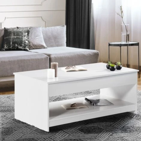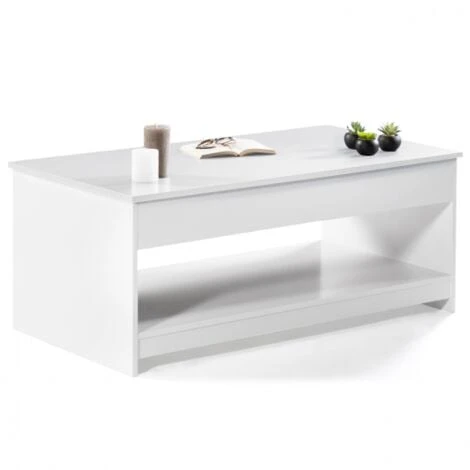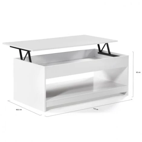 La table basse avec plateau relevable SOA en bois coloris blanc invite le style contemporain dans votre salon ! Grâce Ă son design, elle apportera une touche de dĂ©coration moderne Ă votre intĂ©rieur.Cette jolie table basse, aux finitions soignĂ©es et lĂ©gèrement brillantes, est en panneau de particules de bois (MDF Ă©paisseur 1,5 cm). Sa structure offre une vraie stabilitĂ© et une vĂ©ritable robustesse.Astucieux et utile, son plateau relevable vous permettra de vous adapter Ă toutes les situations : un apĂ©ritif organisĂ© entre amis ou un repas devant la tĂ©lĂ©vision. Vous bĂ©nĂ©ficiez ainsi d’une solution pour manger tout en conservant une position confortable.Le mĂ©canisme en acier laquĂ© epoxy noir de cette table basse permet au plateau de se relever sur 12 cm.Pratique, sous son plateau est dissimulĂ© un espace de rangement !Vous n’avez plus qu’Ă profiter de cet espace de rangement ! Vous pouvez Ă©galement y poser vos objets de dĂ©coration ! Il y a Ă©galement un espace de rangement situĂ© sous le plateau ! Cette table offre de nombreux espaces de rangement !Dimensions de la table basse plateau relevable SOA bois blancheDimensions globales : Longueur 110 cm x largeur min. 60,5 cm – largeur max. 80 cm x Hauteur min. 45,5 cm – Hauteur max. 57 cmDimensions du plateau relevable : L. 110 cm x l. 60,5 cmDimensions de l’intĂ©rieur de la table basse/de l’espace de rangement : L. 105 x l. 55 cm x H. 9,5 cmDimensions de la niche de rangement du bas : L. 105 x l. 58 x H. 21 cmĂ€ monter soi-mĂŞmeLa table basse SOA est disponible en diffĂ©rents coloris sur notre boutique en ligne !