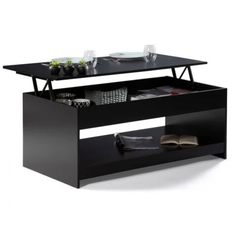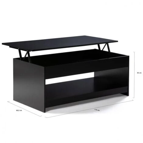 Le design contemporain prend place dans votre salon avec la table basse avec plateau relevable SOA en bois coloris noir ! Son design lui permet d’apporter une touche de décoration moderne à votre intérieur.Cette jolie table basse, aux finitions soignées et légèrement brillantes, est en panneaux de particules de bois mélaminés (épaisseur 1,5 cm). Sa structure offre une vraie stabilité et une véritable robustesse.Astucieux et utile, son plateau relevable vous permettra de vous adapter à toutes les situations : un apéritif organisé entre amis ou un repas devant la télévision. Vous bénéficiez ainsi d’une solution pour manger tout en conservant une position confortable.Le mécanisme en acier laqué epoxy noir de cette table basse permet au plateau de se relever sur 12 cm.Pratique, sous son plateau est dissimulé un espace de rangement !Vous n’avez plus qu’à profiter de cet espace de rangement ! Vous pouvez également y poser vos objets de décoration ! Il y a également un espace de rangement situé sous le plateau ! Cette table offre de nombreux espaces de rangement !Dimensions de la table basse plateau relevable SOADimensions globales: Longueur 110 cm x largeur min. 60,5 cm – largeur max. 80 cm x Hauteur min. 45,5 cm – Hauteur max. 57 cmDimensions du plateau relevable : L. 110 cm x l. 60,5 cmDimensions de l’intérieur de la table basse/de l’espace de rangement : L. 105 x l. 55 cm x H. 9,5 cmDimensions de la niche de rangement du bas : L. 105 x l. 58 x H. 21 cmÀ monter soi-mêmeLa table basse SOA est disponible en différents coloris sur notre boutique en ligne !