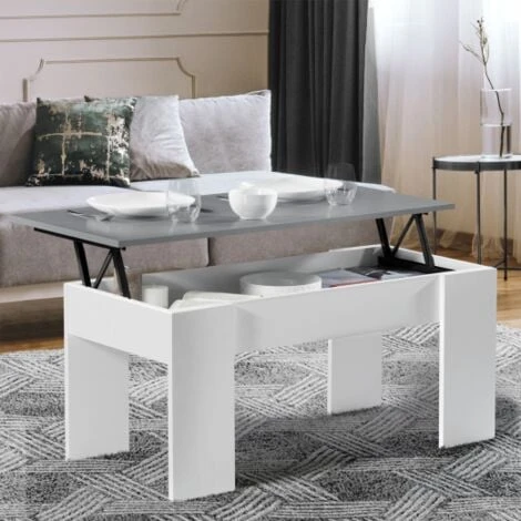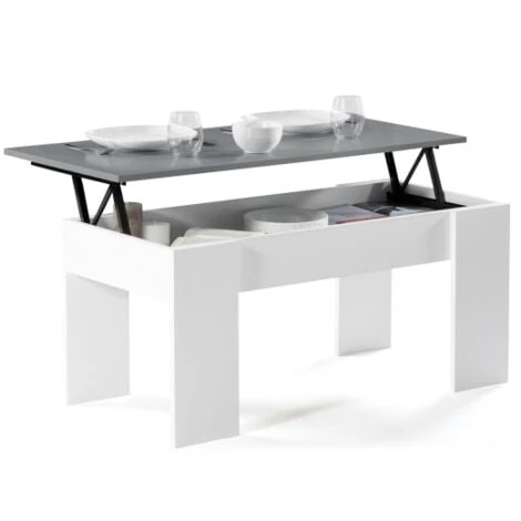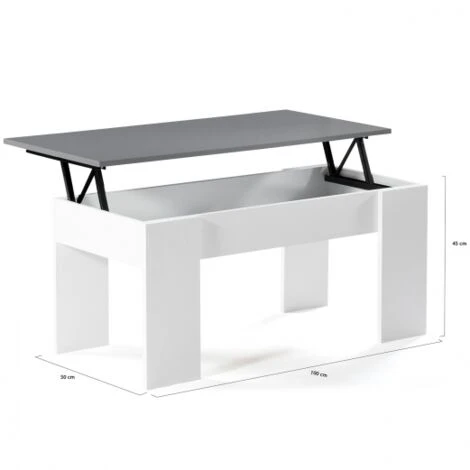 2 en 1, voici la dernière génération de table basse astucieuse avec système de plateau relevable : d’une simple table basse, elle se transforme en table à manger pratique !Son plateau relevable, adaptable à toutes les situations, vous permettra d’organiser un apéritif entre amis ou prendre un repas devant la télévision tout en gardant une position confortable dans votre canapé.Fonctionnelle, elle offre également une solution de rangement grâce au compartiment situé sous le plateau. Rangez vos revues et télécommandes et gardez un espace libre pour poser vos plateaux télés !Grâce à son mécanisme en acier laqué epoxy noir, le plateau de cette jolie table basse se relève sur 12 cm en un clin d’oeil.Une fois fermée avec ses lignes épurées, cette table basse en bois, style contemporain, apportera une ambiance chaleureuse à votre intérieur. Son design et ses finitions soignées offriront à votre salon une touche de modernité ! La structure de cette jolie table basse est en panneaux de particules de bois (PB mélaminé épaisseur 1,5 cm). Surélevée de 4 pieds, sa structure lui confère stabilité et robustesse.Optez pour l’ingéniosité de cette table basse à plateau relevable en bois coloris blanc / plateau gris anthracite : finitions soignées et légèrement brillantes.Dimensions de la table basse plateau relevable TARADimensions totales : Longueur 100 cm x largeur 50 cm x Hauteur 45 cm (table refermée) / 57 cm (plateau relevé)Dimensions des pieds : H. 43 x l. 17 cm Dimensions du plateau relevable : L. 100 x l. 50 cmDimensions de l’espace de rangement à l’intérieur de la table basse : L. 95 x l. 41,5 x H. 9,5 cmÀ monter soi-mêmeModèle disponible dans d’autres coloris :- Table basse plateau relevable TARA bois blanc- Table basse plateau relevable TARA bois blanc et imitation hêtre- Table basse plateau relevable TARA bois imitation hêtre- Table basse plateau relevable TARA bois blanc et effet bétonRetrouvez l’ensemble de nos tables basses plateau relevable sur notre boutique en ligne !