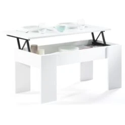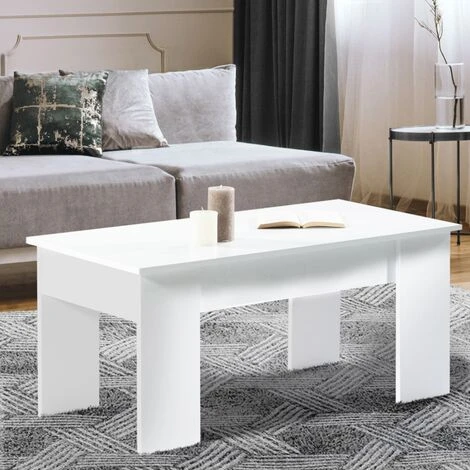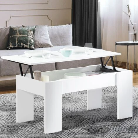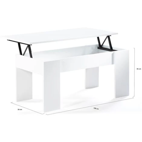 Le style contemporain prend place dans votre salon avec notre table basse avec plateau relevable en bois blanc.Son design apportera une touche de décoration moderne à votre intérieur.Cette jolie table basse, aux finitions soignées, surélevée de 4 pieds, est en panneaux de particules de bois (PB mélaminé épaisseur 1,5 cm). Sa structure offre une vraie stabilité et une véritable robustesse.Astucieux et utile, son plateau relevable vous permettra de vous adapter à toutes les situations : un apéritif organisé entre amis ou un repas devant la télévision. Vous bénéficiez ainsi d’une solution pour manger tout en conservant une position confortable.Le mécanisme en acier laqué epoxy noir de cette table basse permet au plateau de se relever sur 12 cm.Pratique, sous son plateau est dissimulé un espace de rangement !Vous n’avez plus qu’à profiter de cet espace de rangement !Vous pouvez également y poser vos objets de décoration !Dimensions de la table basse plateau relevable TARADimensions totales : Longueur 100 x largeur 50 cm x Hauteur 45 à 57 cmHauteur table refermée : 45 cmHauteur avec plateau relevé : 57 cmDimensions pieds : H. 43 x l. 17 cmDimensions plateau relevable : L. 100 x l.50 cmDimensions espace de rangement à l’intérieur : L. 95 x l. 41,5 x H. 9,5 cmÀ monter soi-mêmeModèle disponible dans d’autres coloris :- Table basse plateau relevable TARA bois blanc et gris- Table basse plateau relevable TARA bois blanc et imitation hêtre- Table basse plateau relevable TARA bois imitation hêtre- Table basse plateau relevable TARA bois blanc et effet bétonRetrouvez l’ensemble de nos tables basses plateau relevable sur notre boutique en ligne !