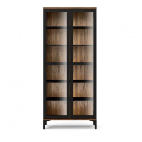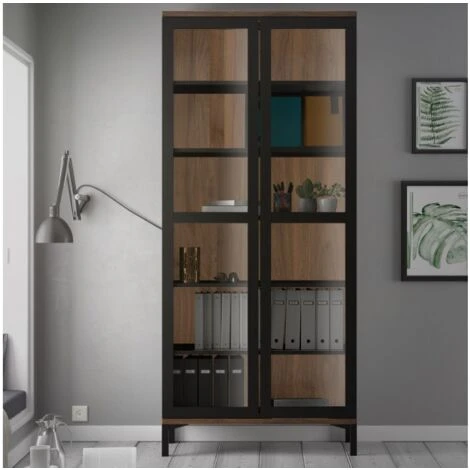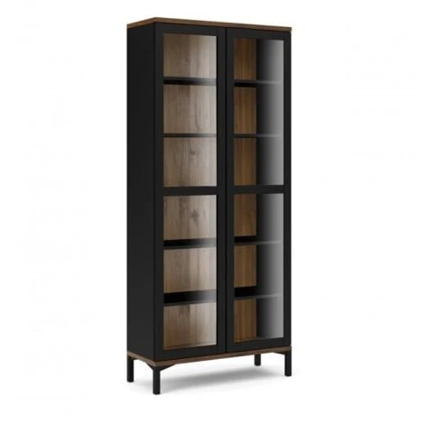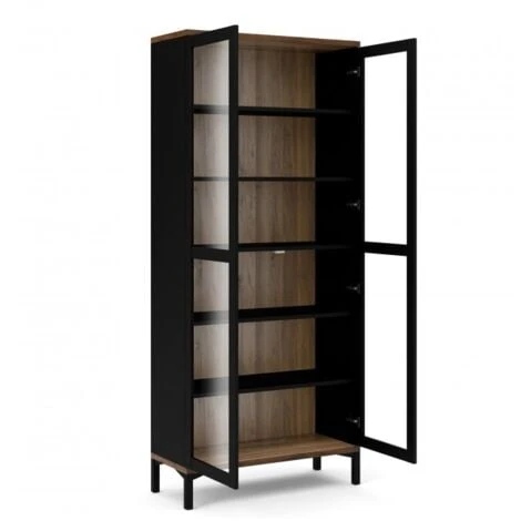 Vitrine salon 203 cm Noir mat et Noyer avec deux portes et cinq étagères